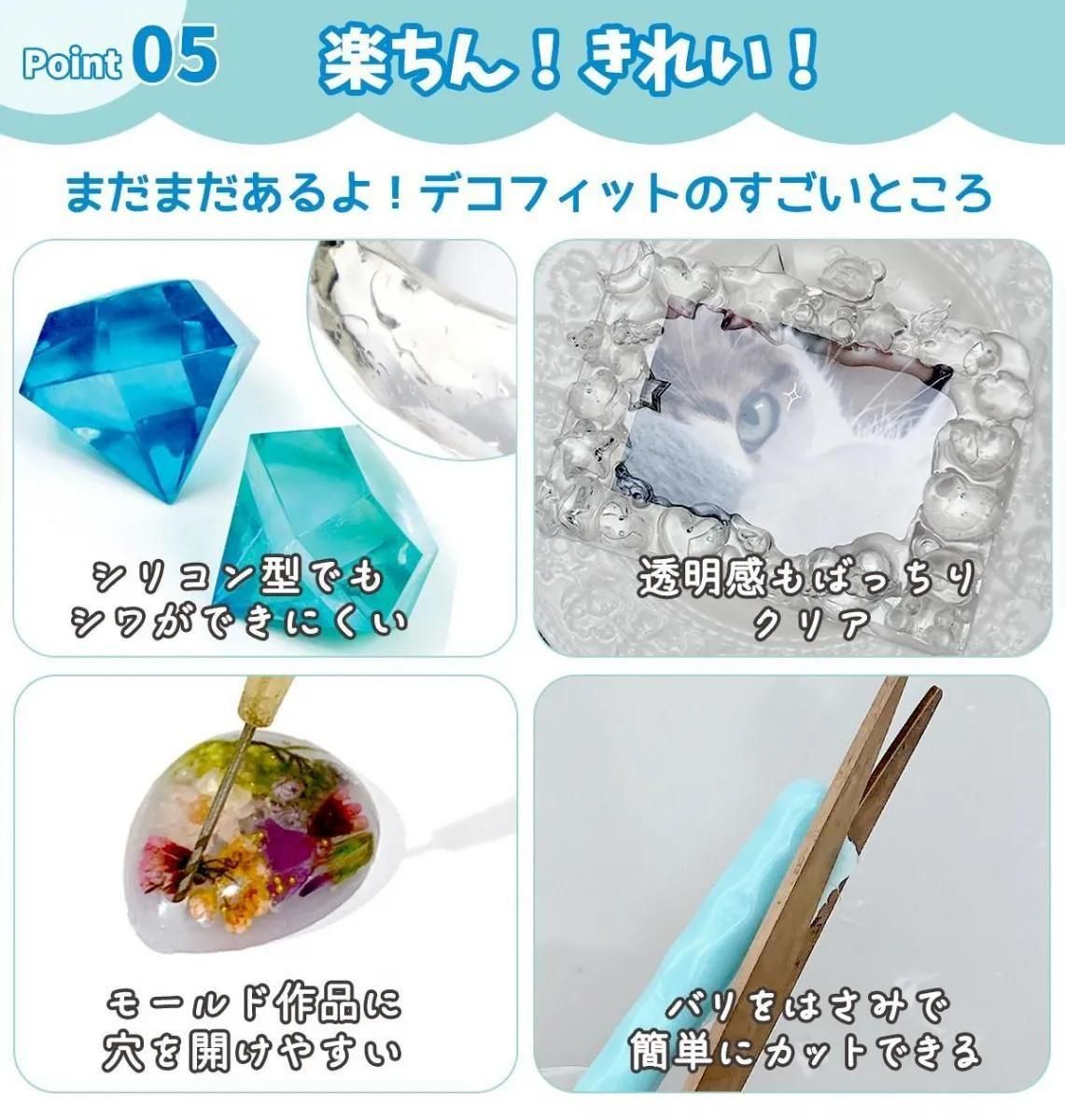 さっそく使わせて頂きました。しっかり定着しそりもなく使いやすいとおもいます。モールドにも使用しましたが硬化も早くて固すぎず柔らかすぎずで透明でデコだけじゃなく使えそうでした。