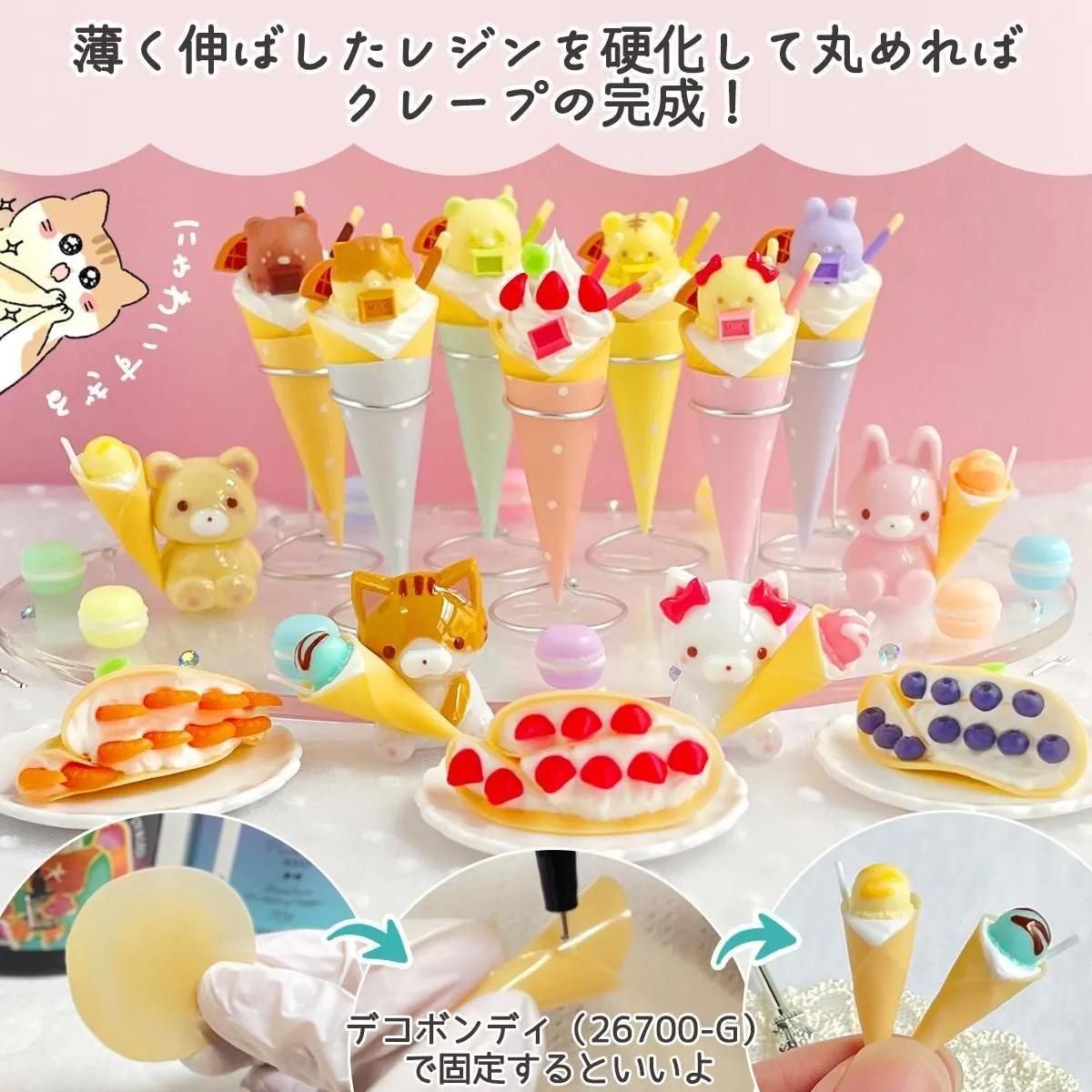 薄く伸ばしたレジンを硬化して丸めたら、クレープも作れるよ!ホイップを絞ってデコを楽しんでね♪ドライフラワーのコーティングにもおすすめ!