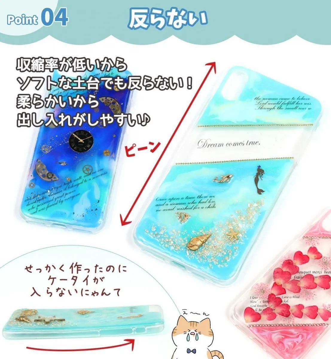 ハードタイプのレジン液では反りやすかったスマホケースや定規のような面積の広い作品でもばっちり反りにくく、きれいに硬化できます。柔らかいから出し入れもしやすいよ♪