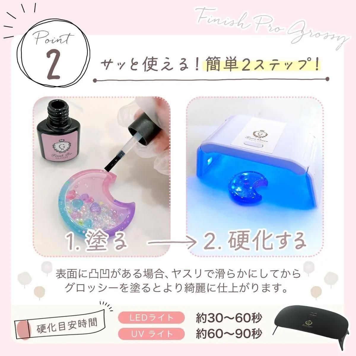 ○硬化時間:LEDライトで30〜60秒程度、またはUVライトで60〜90秒程度