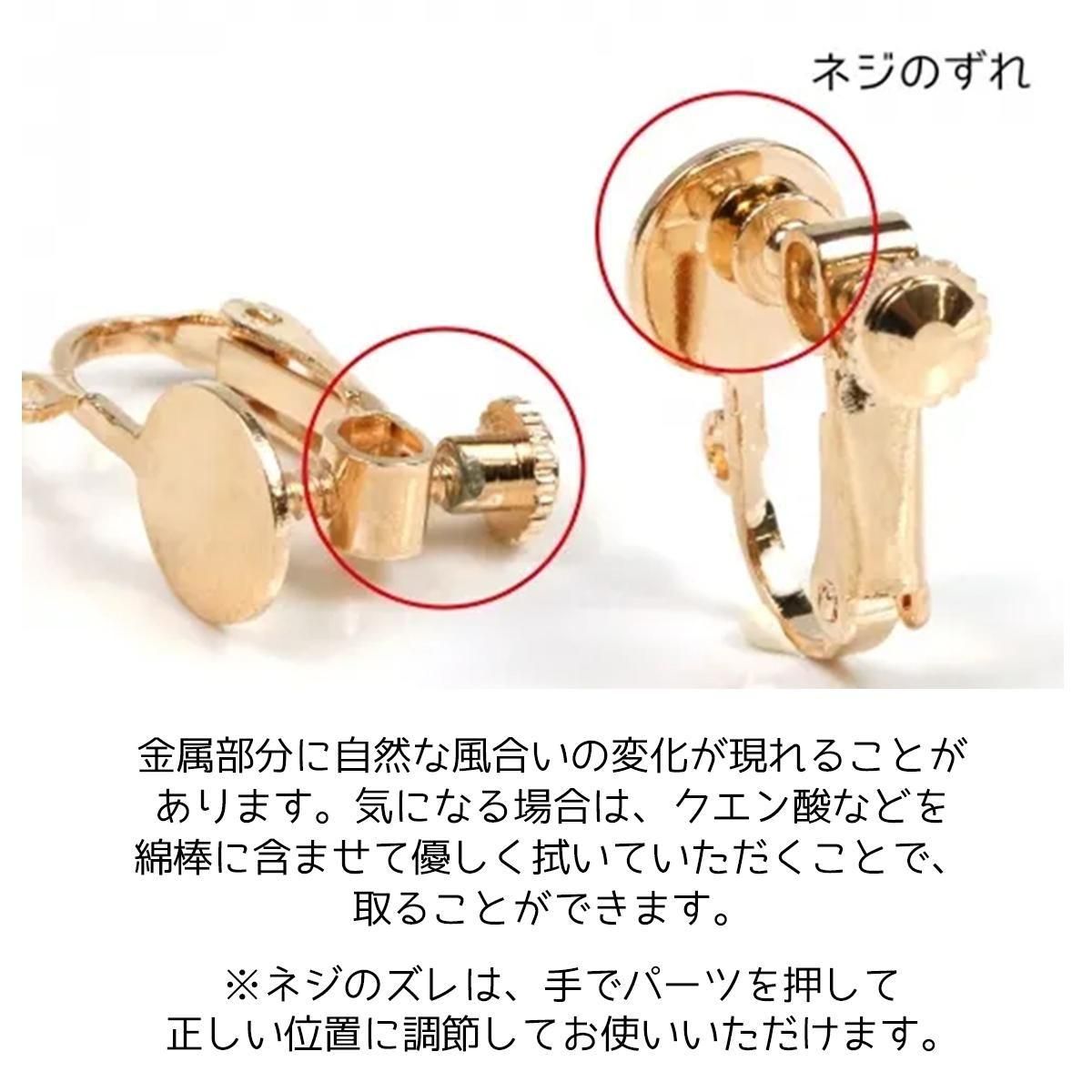 ●イヤリングの金属部分に自然な風合いの変化が現れることがあります。クエン酸などを綿棒に含ませて優しく拭いていただくことで取ることができます。
