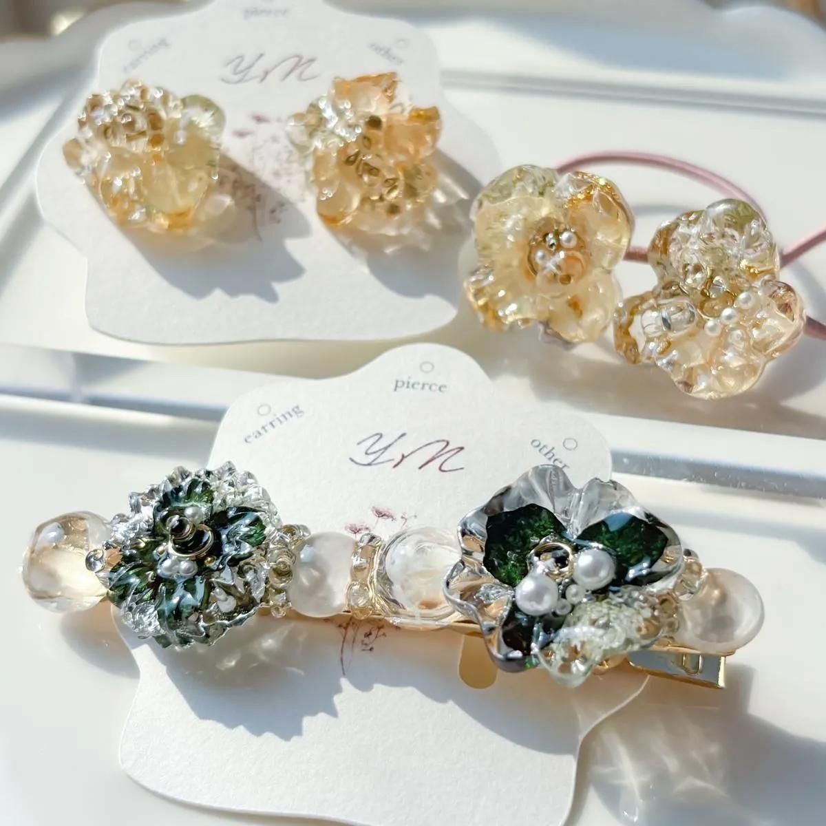 ヘアクリップやバレッタ・ピアスなど、金具に制作したパーツを貼り付けるだけでかわいいアクセサリーや雑貨が作れます!クリア仕上げや不透明仕上げで作品の印象がグッと変わるから、いろんなアレンジを楽しんでみてね^^