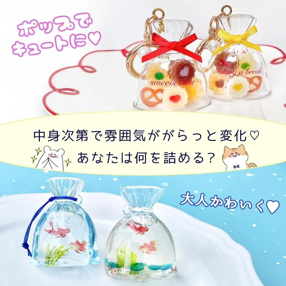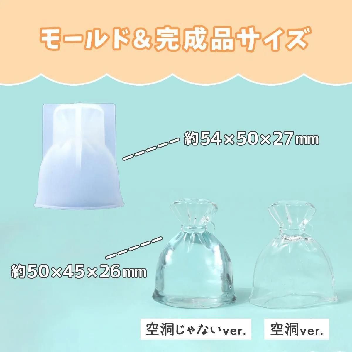 ぷっくり立体的な巾着袋が作れるモールド♪中に入れるモチーフで雰囲気ががらっと変わるよ。ドライフラワーや金魚モチーフなど、世界観を表す封入を閉じ込めてオブジェにしたり、中を空洞にしてスイーツパーツや液体を入れたり。あなたのアイデアを光らせて、かわいい作品を作ってね^^