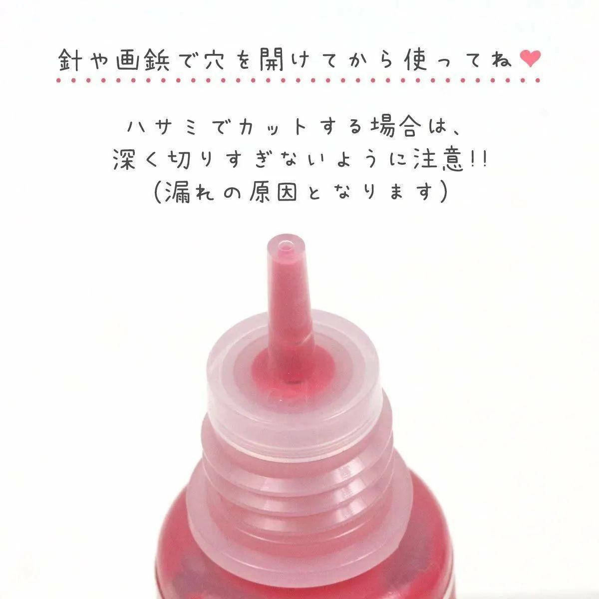 ○着色剤を最初に使用する際は、ノズルの先は空いておりませんので画鋲や針などで穴をあけてください (ハサミでノズルの先を切る場合は、穴が大きくなり漏れの原因にもなりますのでご注意ください。ラメ入り、粉入りの場合は穴が小さいと出にくい場合もあるので、穴の大きさを調整してください)
