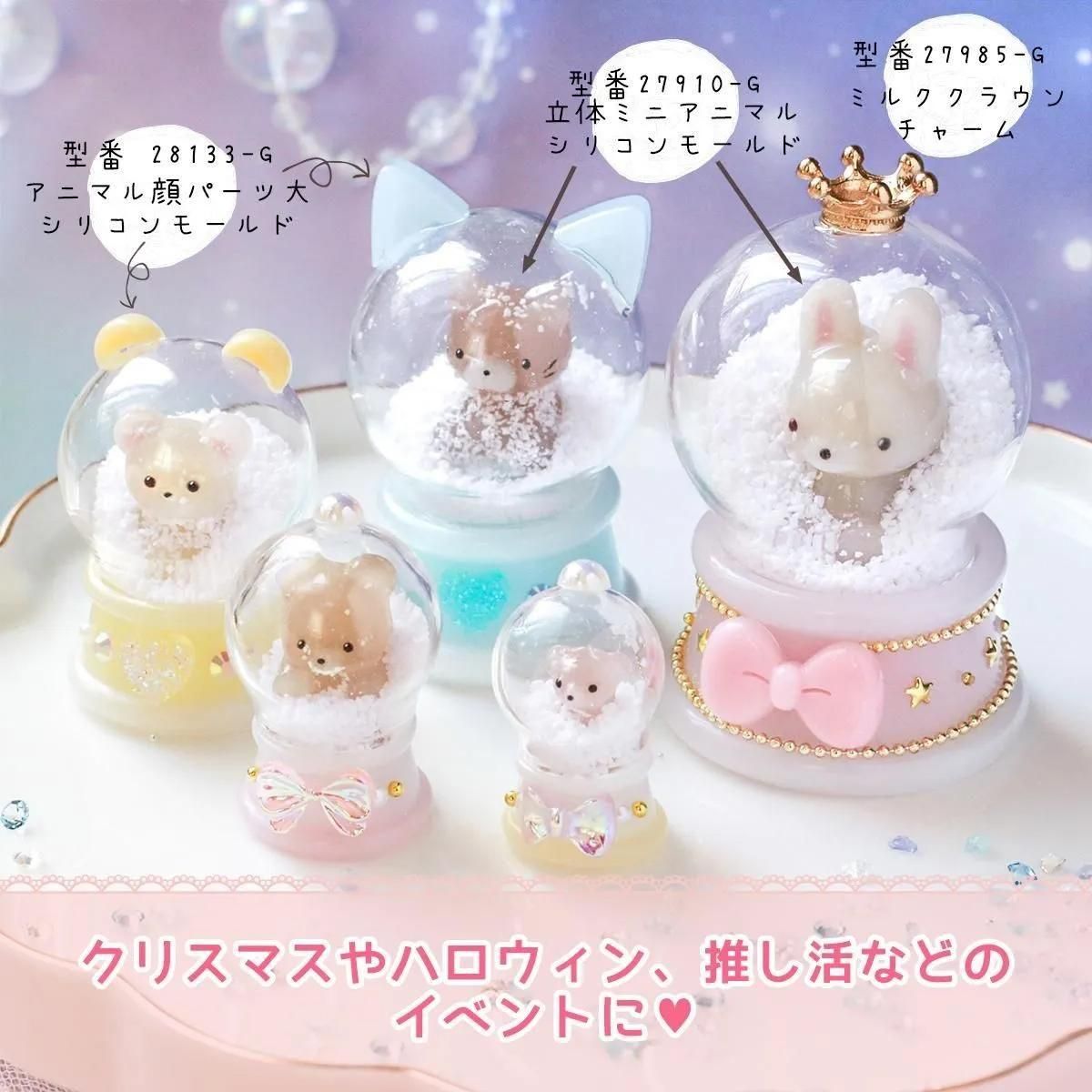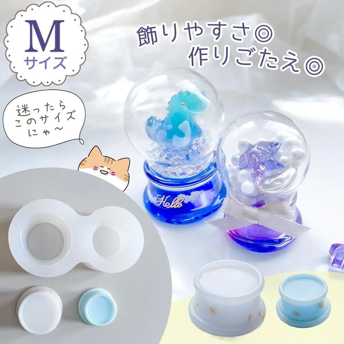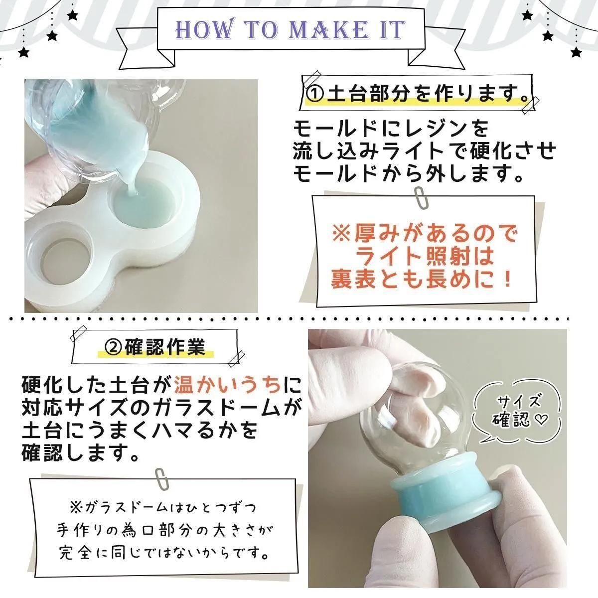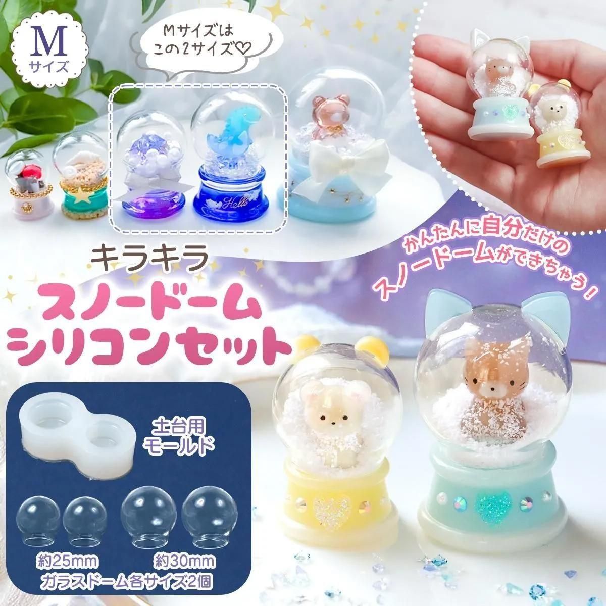 オリジナルのスノードームが手作りできちゃう♪2サイズの台座部分がつくれるシリコンモールドと約30mm、約25mmサイズのガラスドーム各2個をセットにしました。