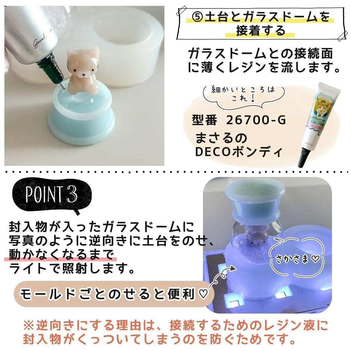 レジンやラメ、ドライフラワー、ミニパーツなど、お好きな封入素材や飾りを入れて、小さな世界を完成させてね!