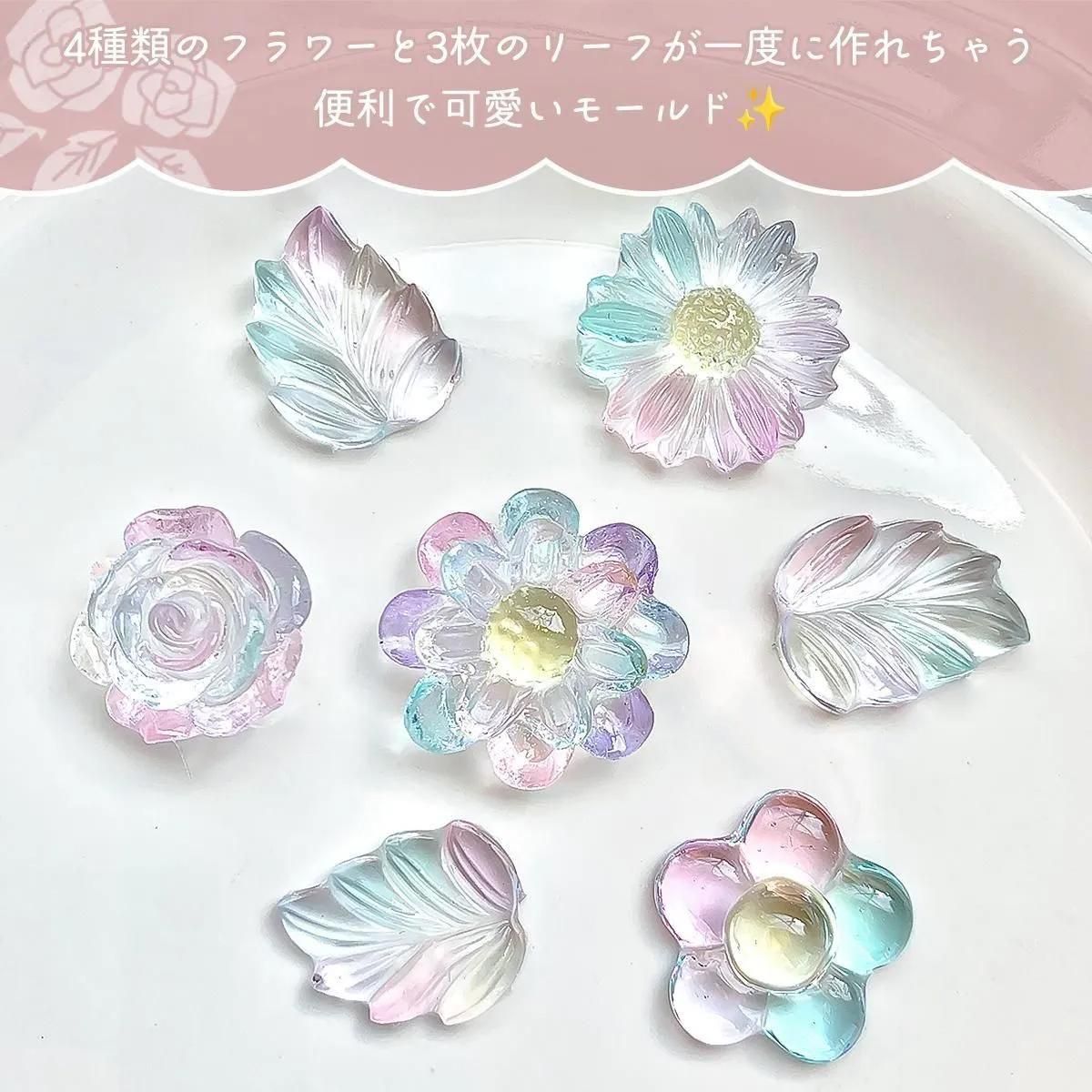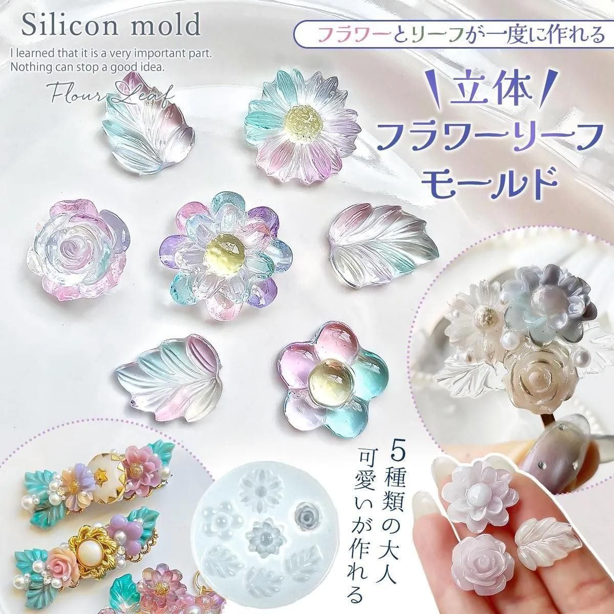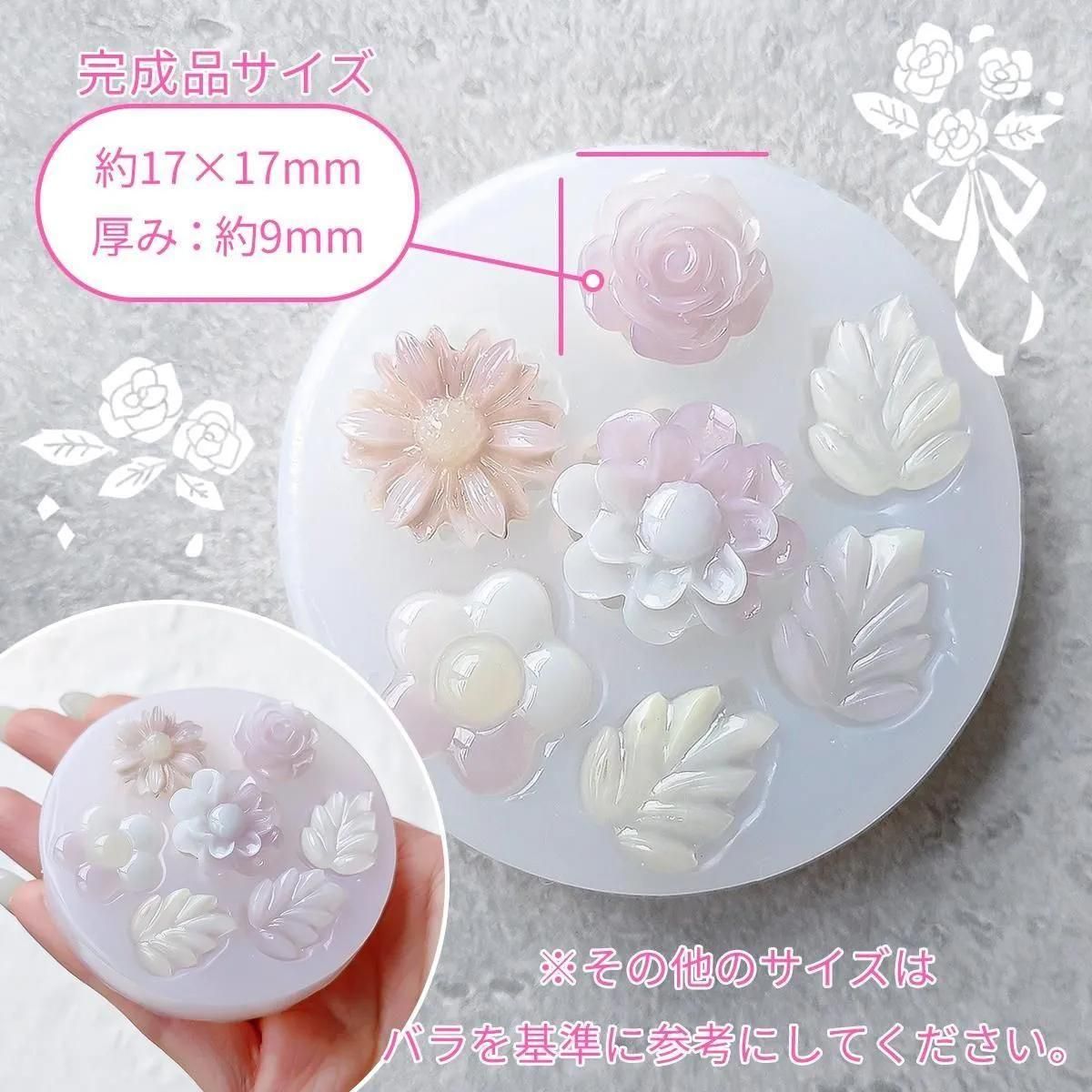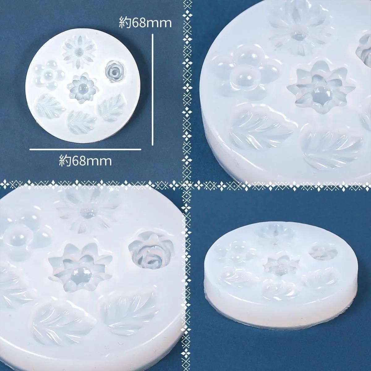 上品で繊細な4種類のフラワーと3枚のリーフが作れるシリコンモールド。裏面が平たいカボションタイプだから、アクセサリー金具などに貼り付けもカンタン♪