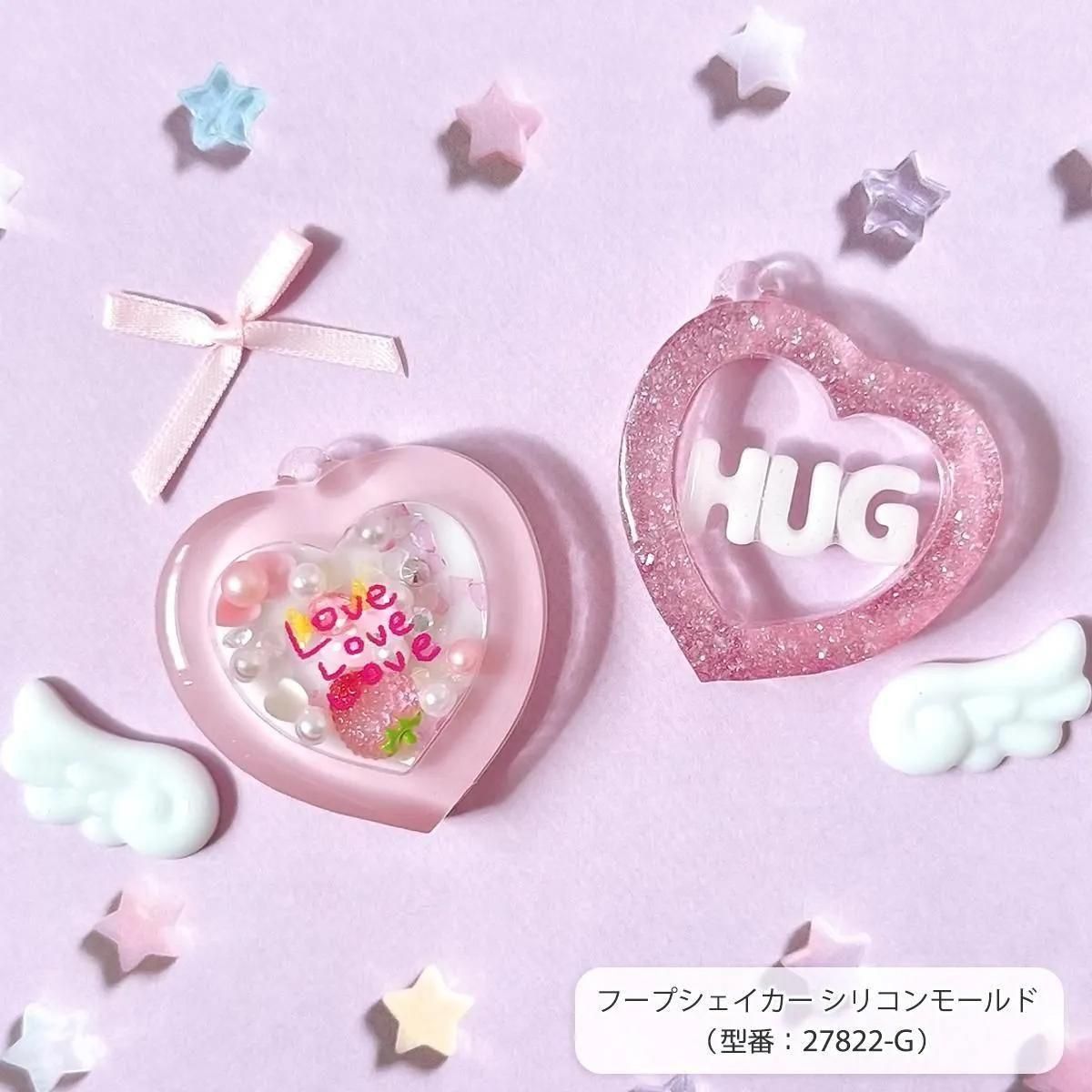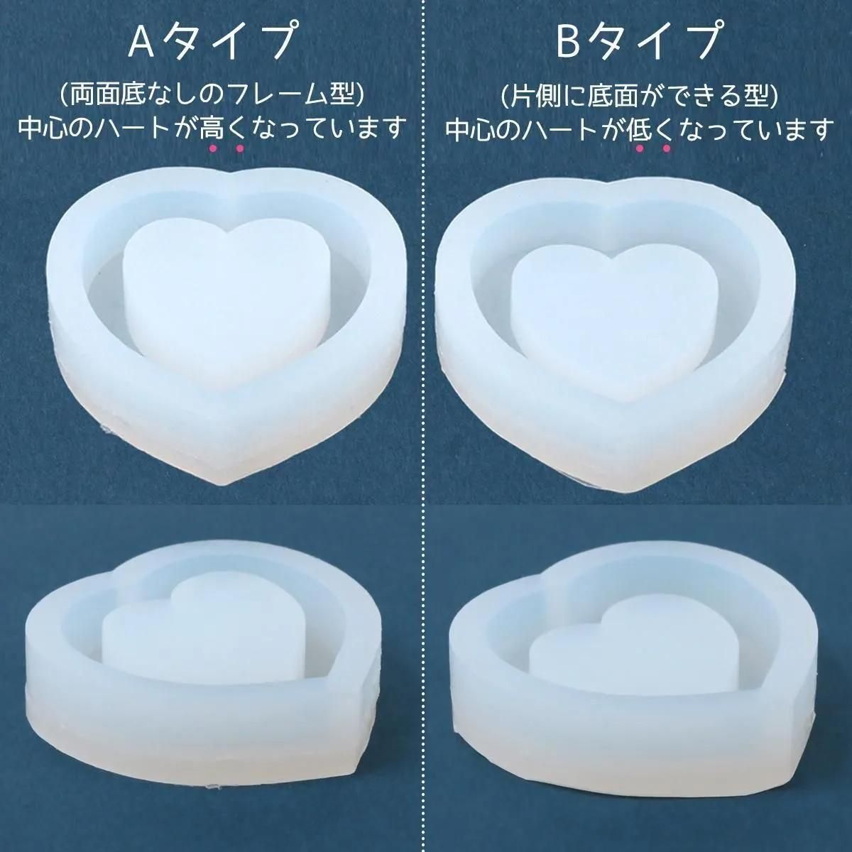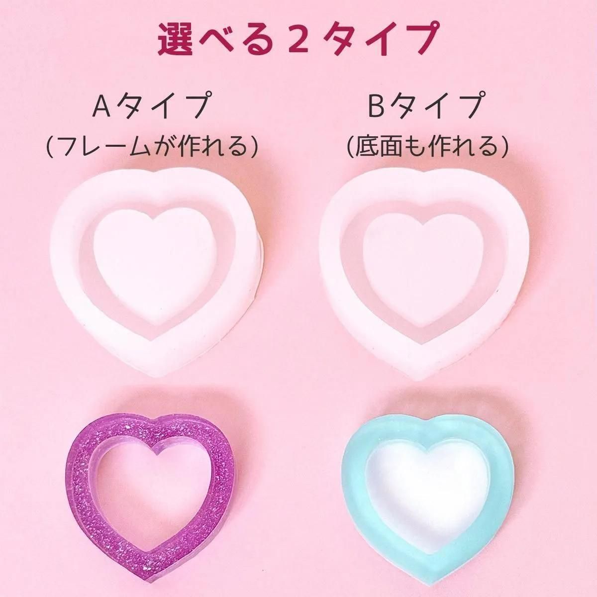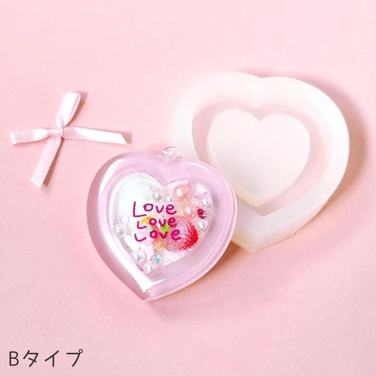 Aタイプは両面底なしのモールドで、フレーム状に抜けたハートが作れるよ。内側にカンパーツをつけて好きなパーツをぶら下げれば、ゆらゆら揺れる可愛いチャームに♪ Bタイプは片側に底面が出来るタイプのモールドで、フィルムを貼って中にパーツを入れてカシャカシャさせたり、マホウノオイルや、ハーバリウムオイル、水などをいれても中身がゆっくり動くからカワイイ!!可愛くデコって楽しんで^^