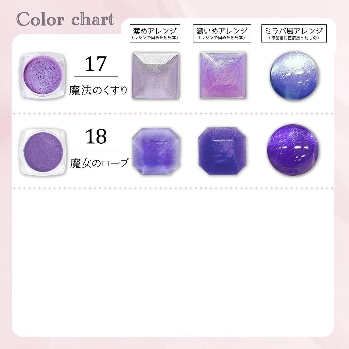 2024謎福袋に入っていた「魔法のもっとやべぇ粉」。全52カラーから、こちらのページではNo.1〜No.18の18色を選べるよ♪