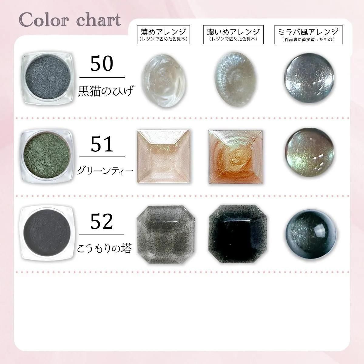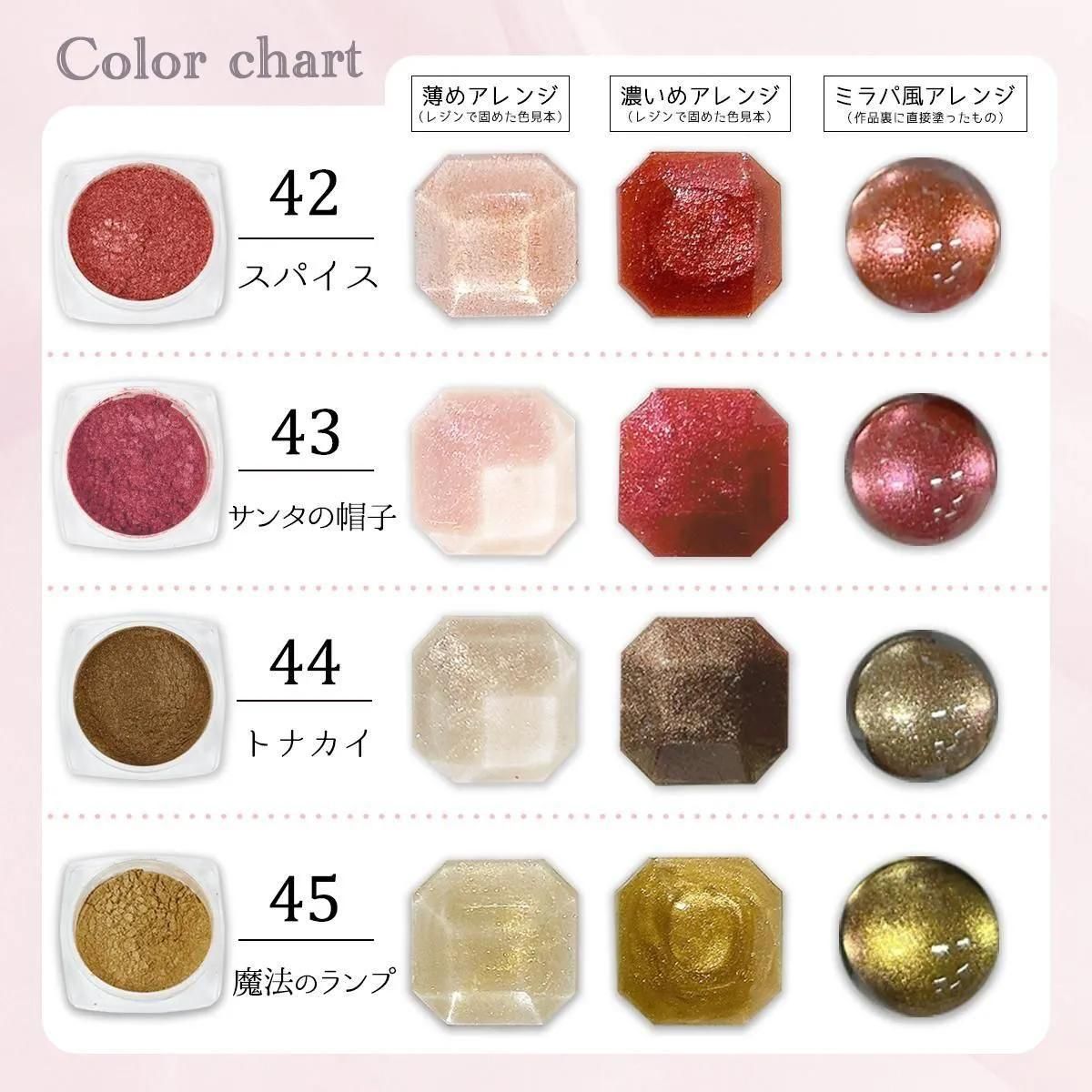 2024謎福袋に入っていた「魔法のもっとやべぇ粉」。全52カラーから、こちらのページではNo.38〜No.52の15色を選べるよ♪