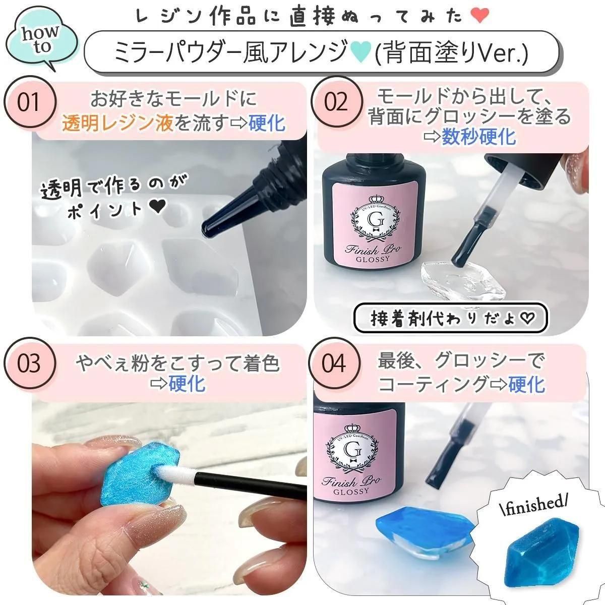 ○硬化後のレジン作品の表面にこするように塗ることで、まるでミラーパウダーのような輝きをプラスできちゃう♪