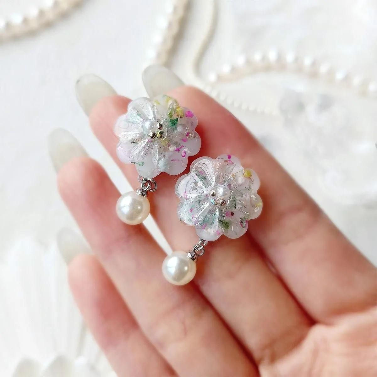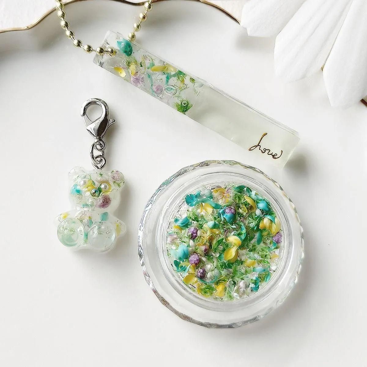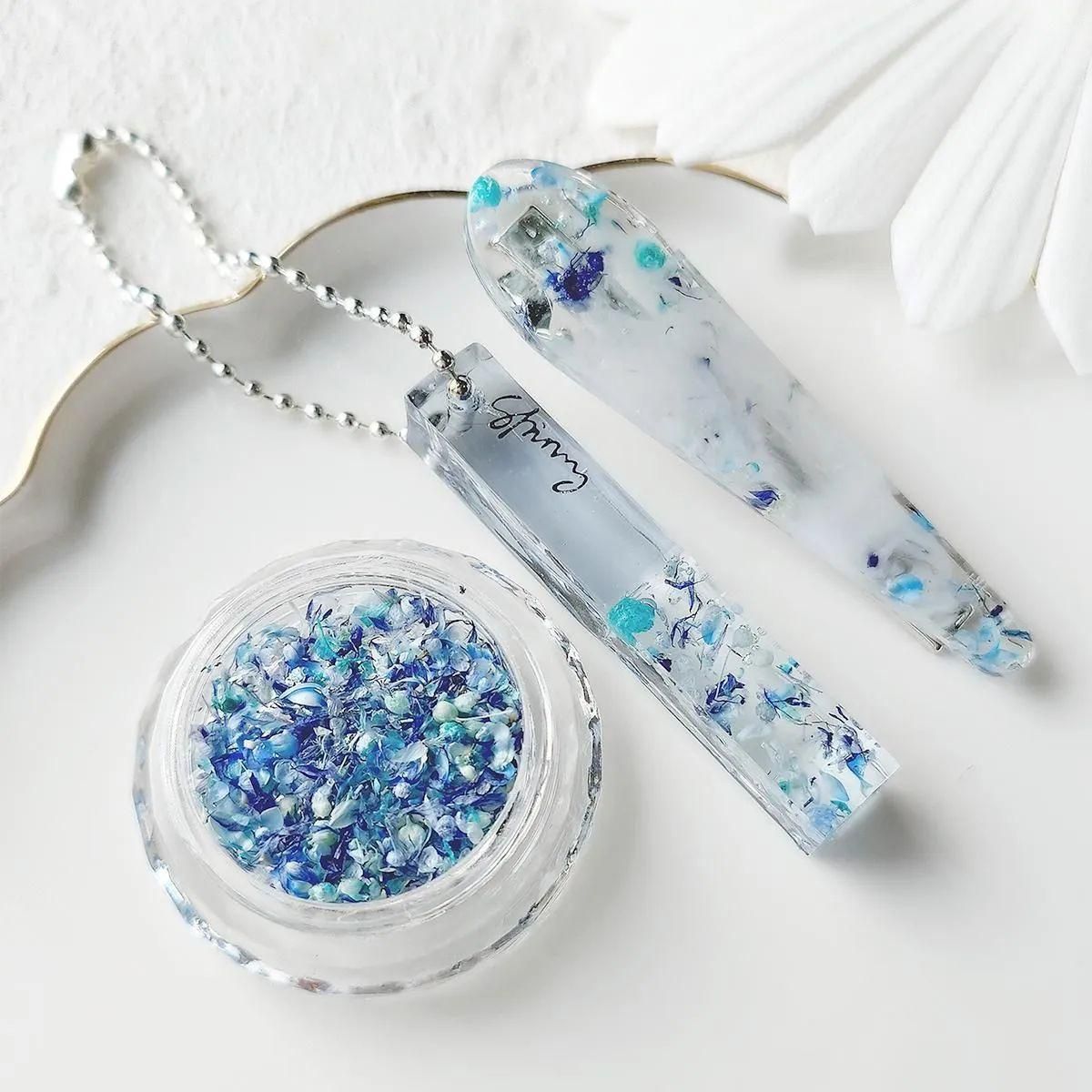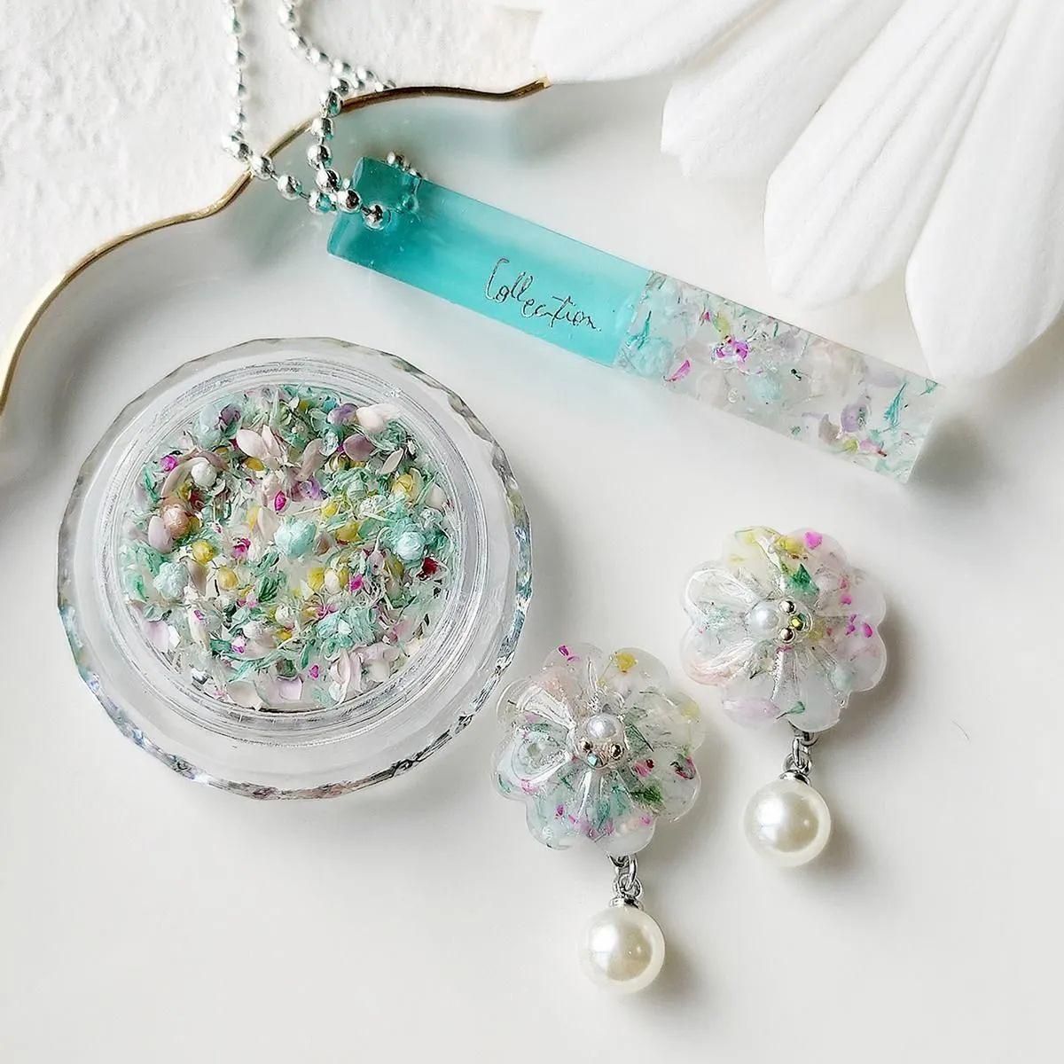 ネックレスやピアス、ヘアアクセサリーなど、レジン液に混ぜ込むだけで華やかな仕上がり。細かいのでレジンクラフトだけじゃなく、ネイルアートにもおススメ^^