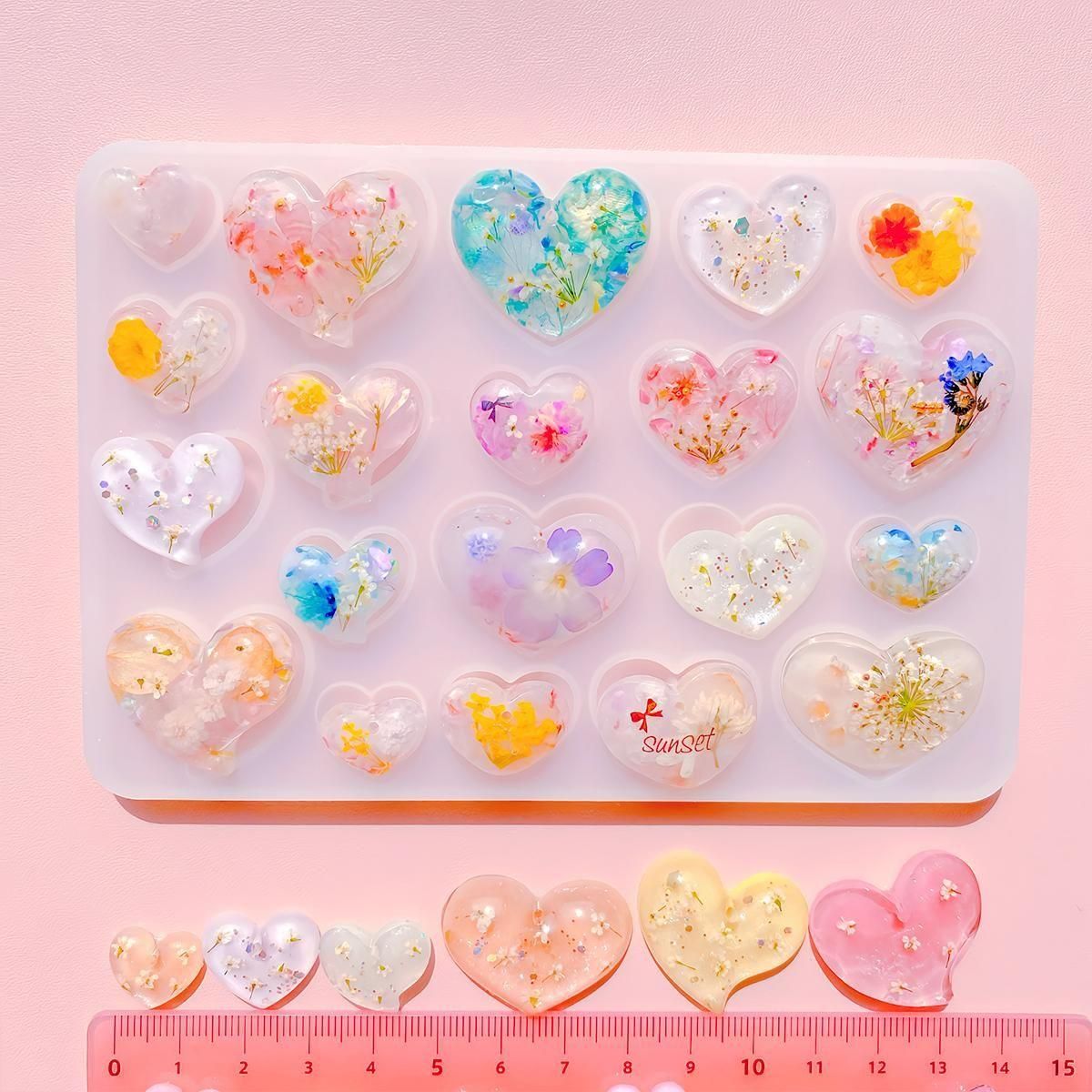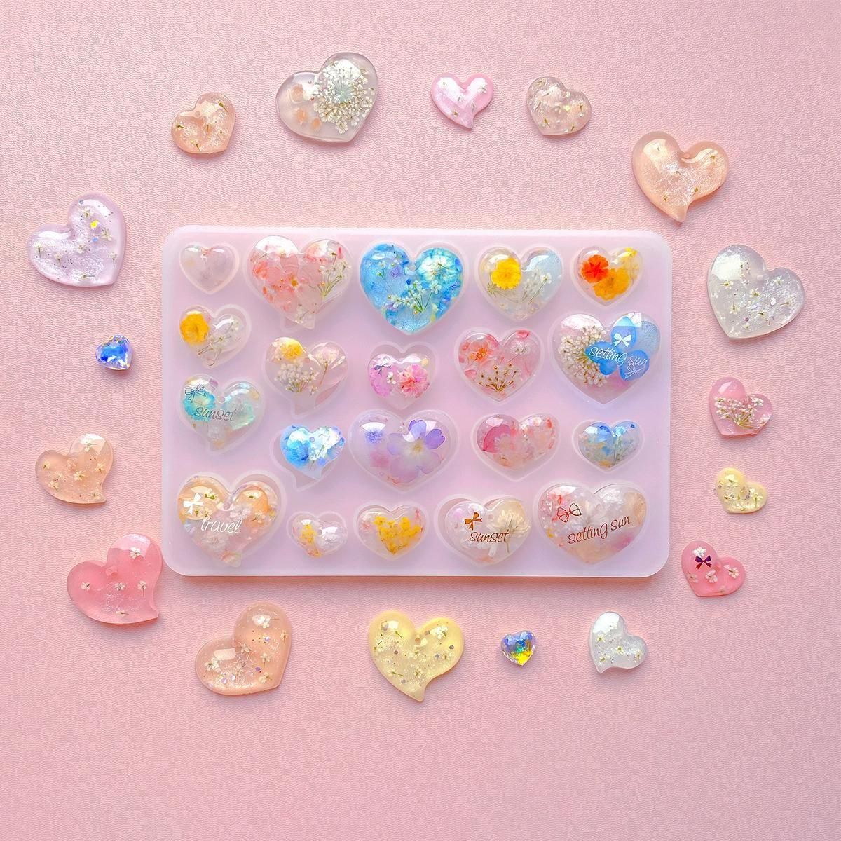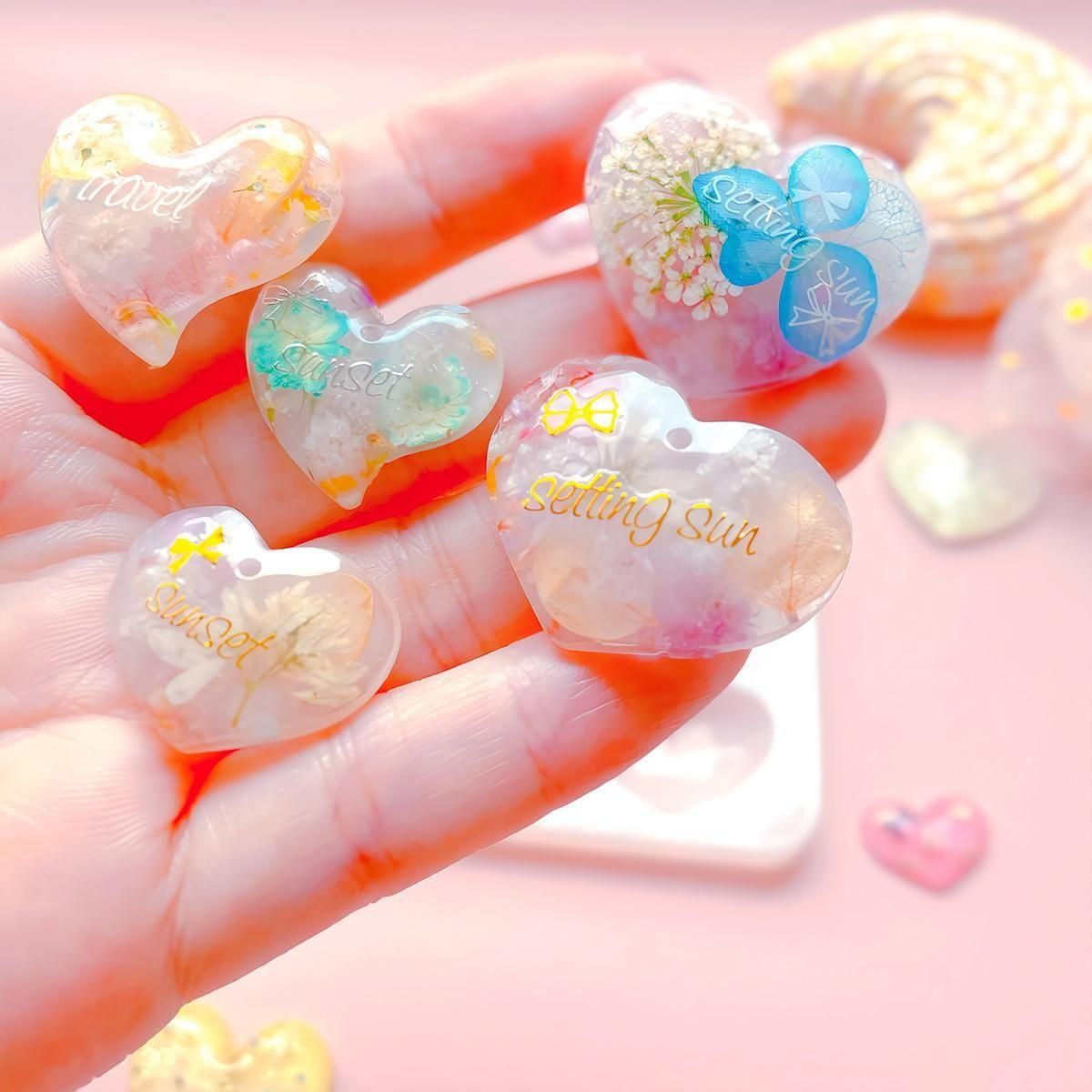 ぷっくりしたシルエットがたまらないパーツがサイズ違いでたくさん作れるシリコンモールド。月や星、雲などの空のアイテムが作れるAタイプと、いろんなハートが作れるBタイプ、好きな方を選んでね♪
