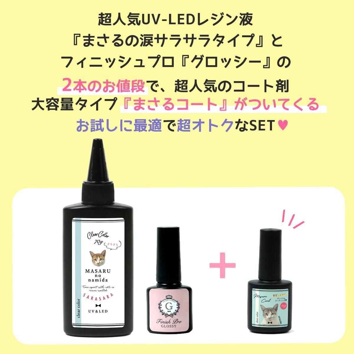 超人気UV-LEDレジン液『まさるの涙 サラサラタイプ』とコーティング用レジン液『フィニッシュプロ・グロッシー』2個のお値段で、大容量タイプコーティングレジン液『まさるコート』がついてくる!お試しに最適で超オトクなSETが登場♪