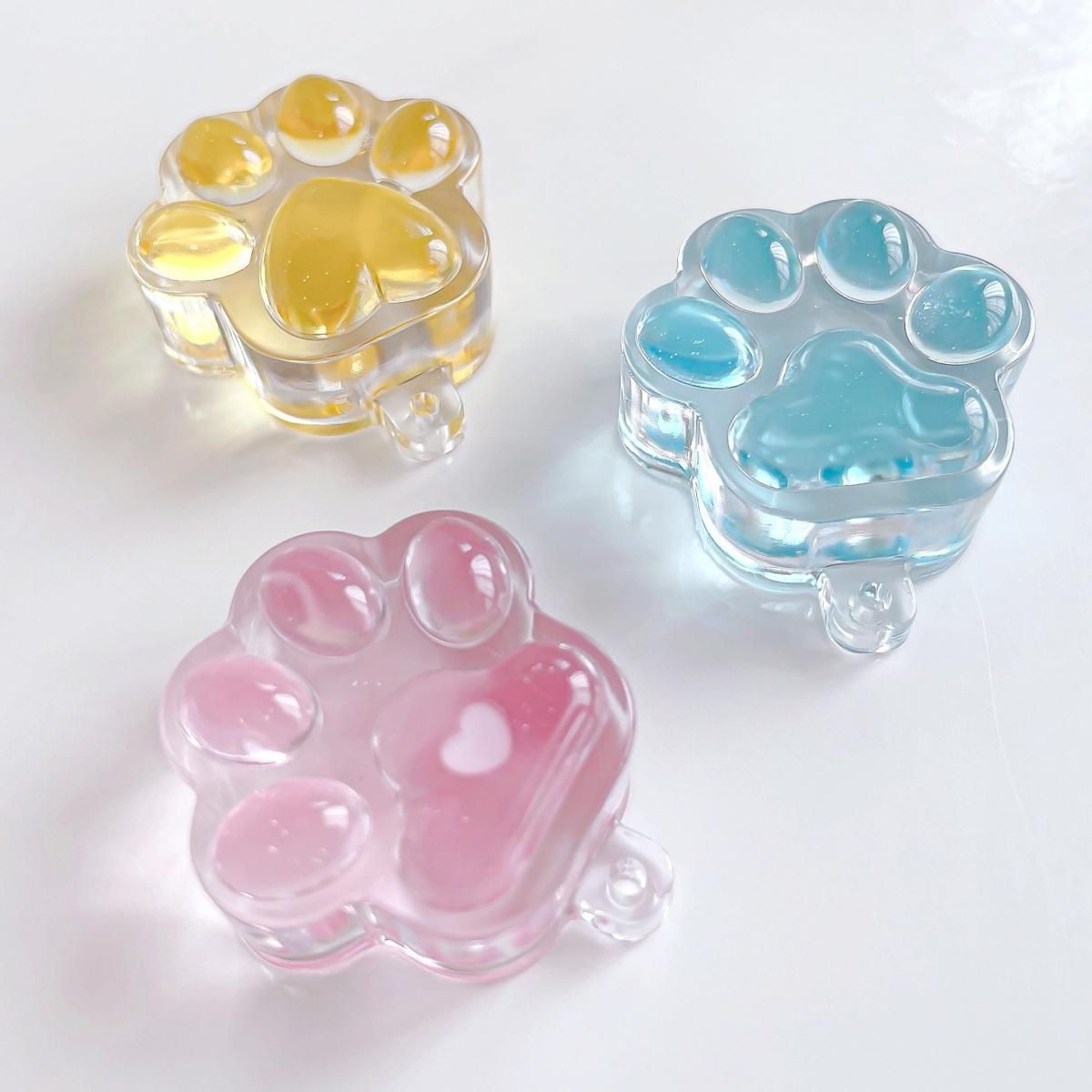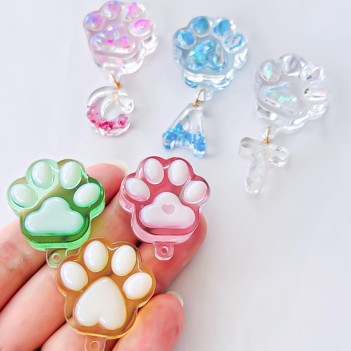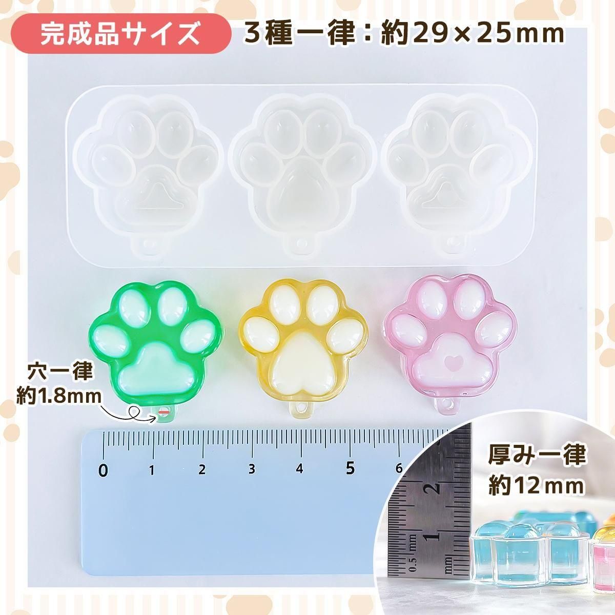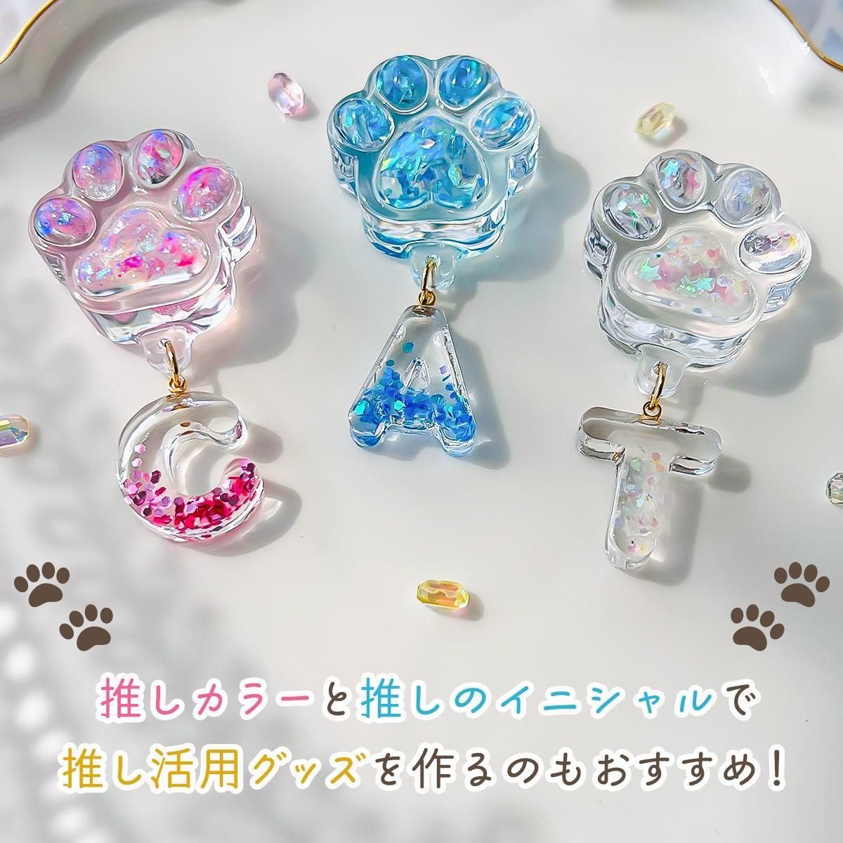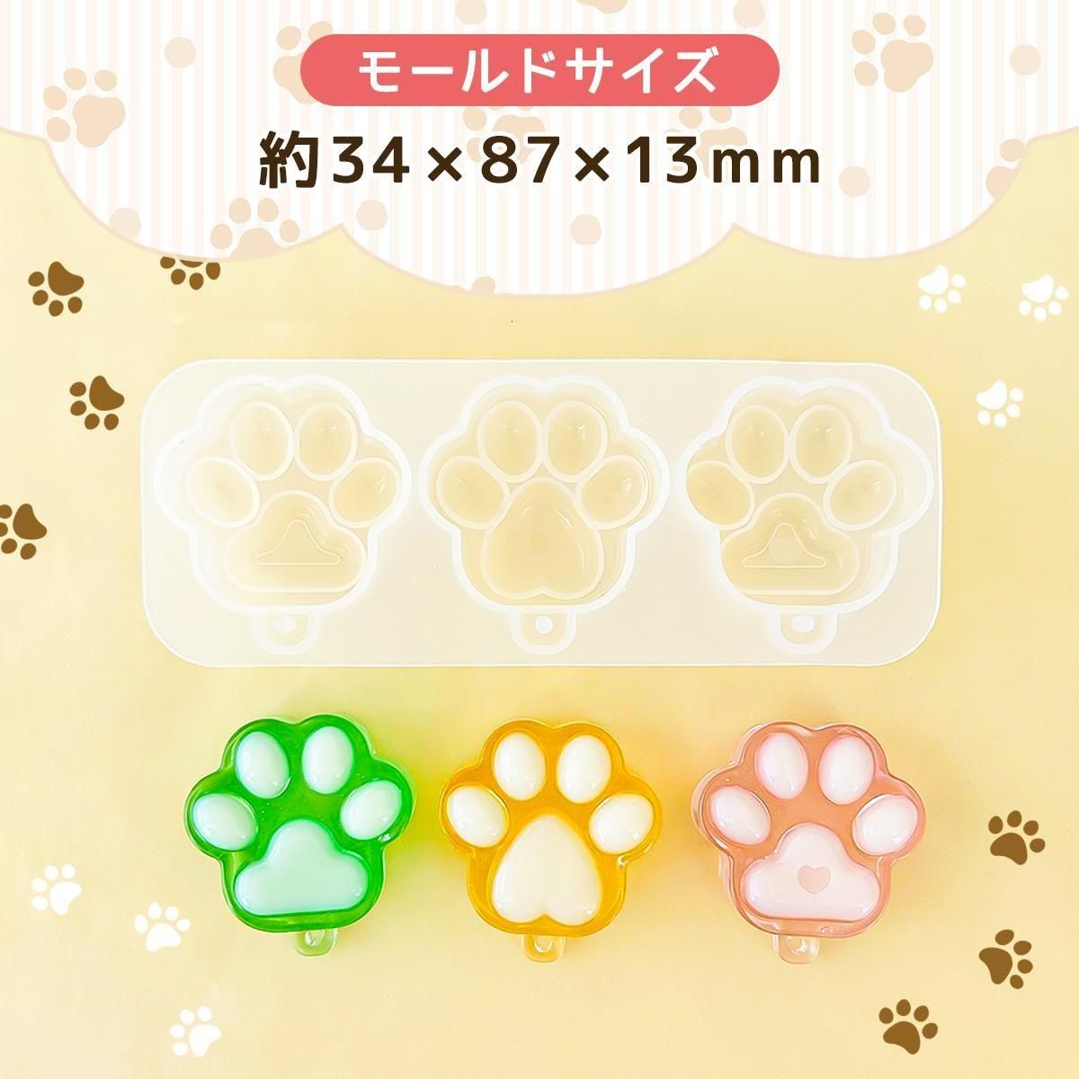 ぷっくりフォルムが可愛い♪少しずつ異なる肉球モチーフが一度に3種類つくれちゃうシリコンモールド。キーホルダーやバッグチャーム、アクセサリーにしてもおすすめです!レジン液を流すだけでカンも作れるから、金具やボールチェーンを通すだけで作品が作れるよ!推しカラーで自分だけのオリジナル推し活グッズにしたり、アルファベットと組み合わせてうちの子グッズにしたり。お子さまと作るのもおすすめ^^