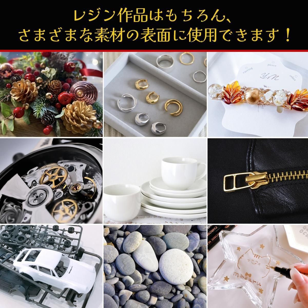 塗った瞬間、レジン作品がメタルパーツみたいに輝く!!まるで塗装したような美しい光沢の、マホウみたいなクロームマーカー。微妙なニュアンスを楽しめる5色のゴールドと、鏡面仕上げの明るいシルバー、はみ出しても安心の専用リムーバーペン、全部使える7本セットです。
