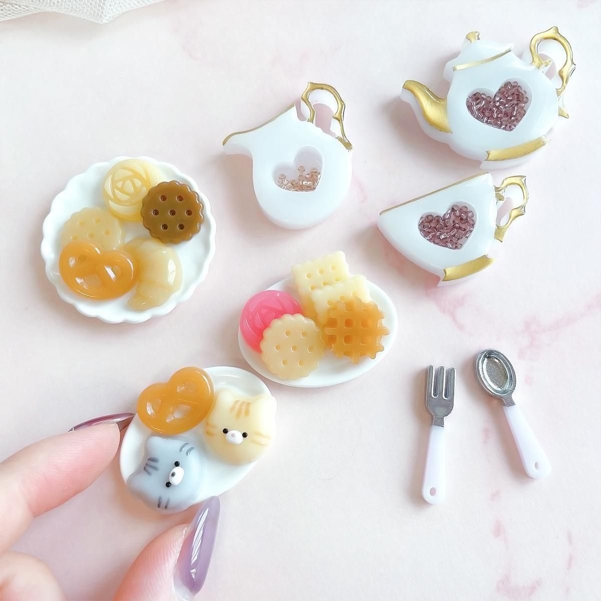 ティーポットとティーカップとデカンタの3種類のシェイカーが作れるよ。中にパーツを入れてカシャカシャさせたり、マホウノオイルや、ハーバリウムオイル、水などを入れると可愛い!その他にビスケットやクロワッサン、プレッツェルなどの焼き菓子に小さなスプーンとフォークまで作れるよ。いろいろなアレンジを楽しんでね^^