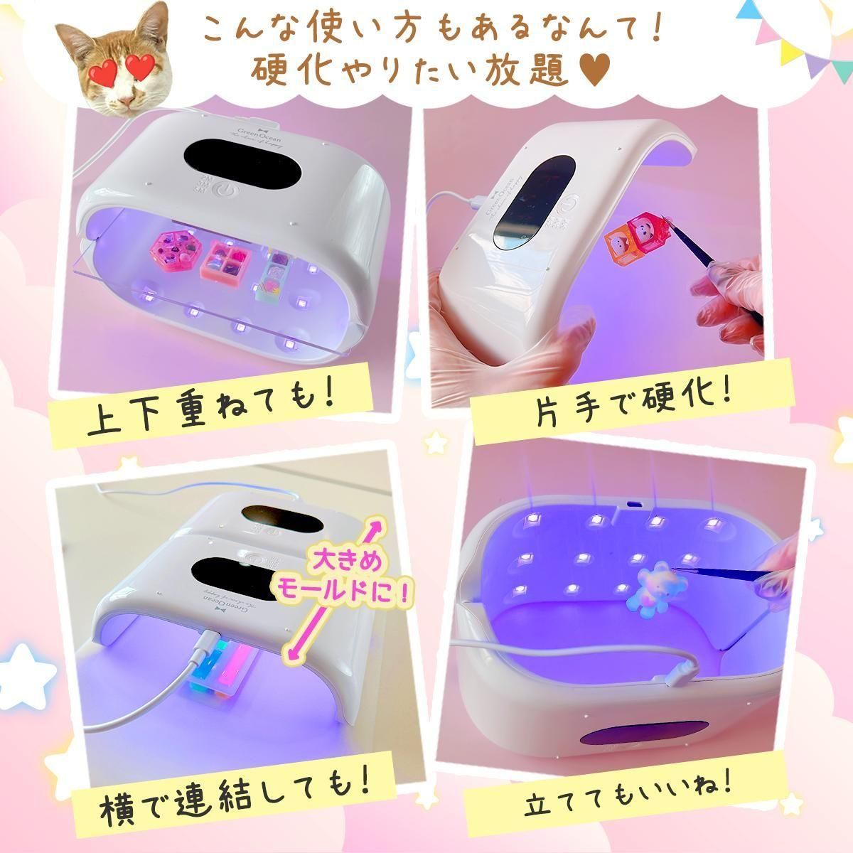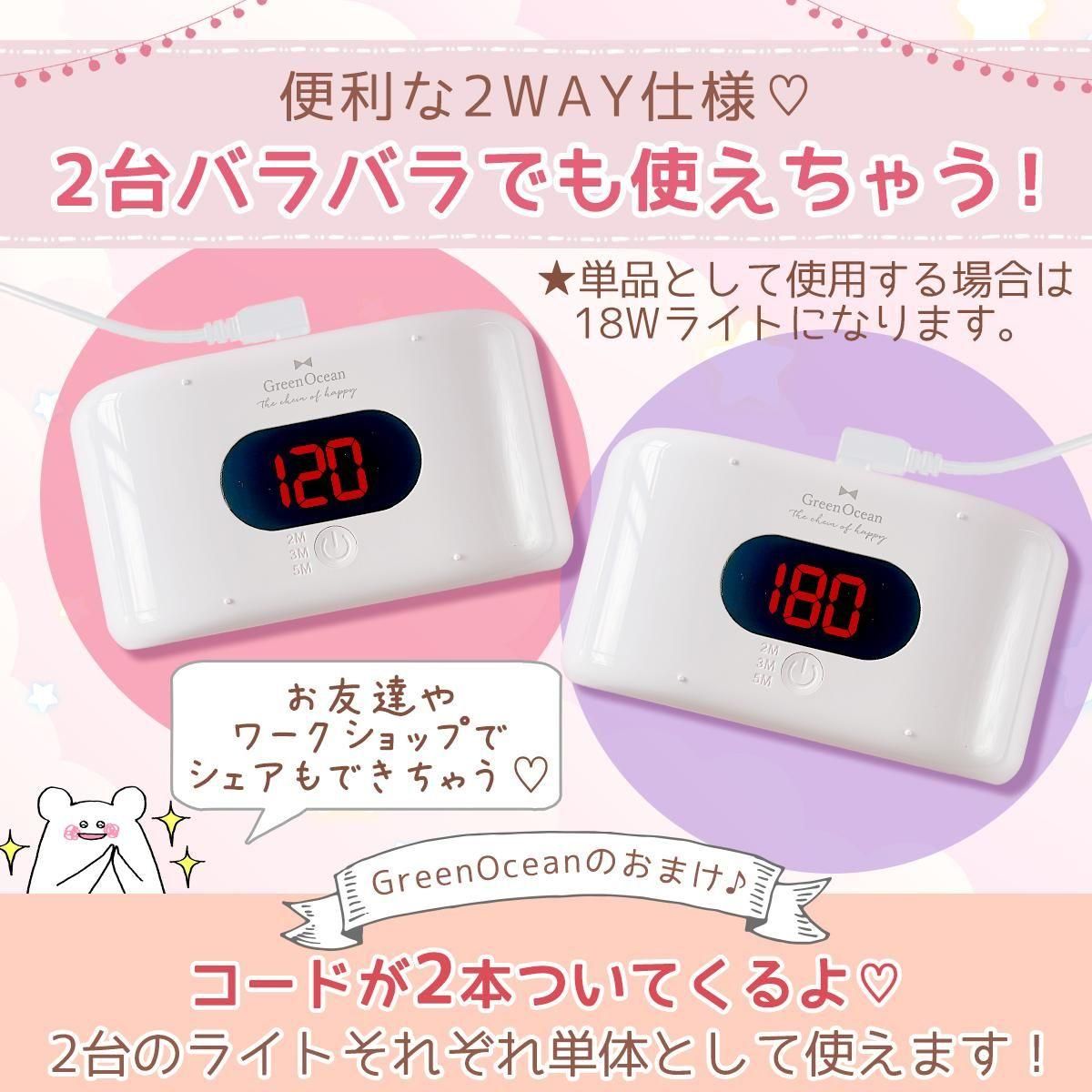 合計36Wのハイパワーでムラなく均一に硬化するから、レジン作品作りにぴったり。タイマーは3段階で設定できるので、安心して作業できます。さらに分離して18Wライト2台としてバラバラでも使える2WAY仕様だから、いろんな硬化スタイルに対応可能!電源コード式で安定したパワーをキープできるので、長時間の作業も安心です。かわいいオリジナルボックス入りで、プレゼントにもおすすめ^^