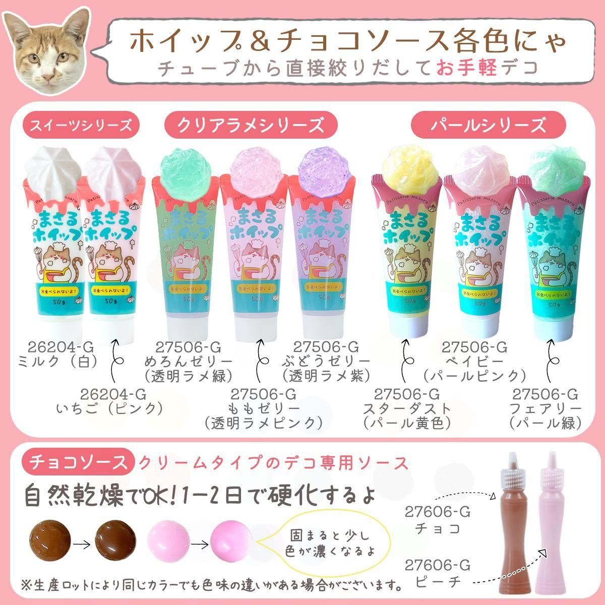 8色のまさるホイップやチョコデコソース、たっぷりのデコパーツやマカロンパーツ、ミニ2段ケーキ容器などなど、デコホイップがいっぱい使えるアイテム満載のセットです。