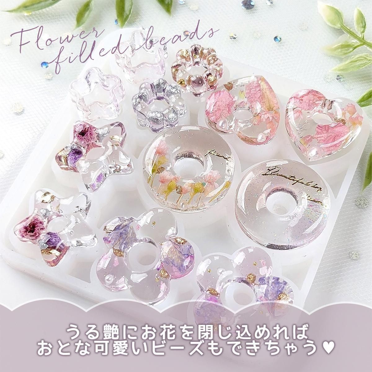 自分だけのオリジナルビーズが作れちゃう♪ドーナツみたいなリング型やおはじきみたいなお花型、ハートや星など、かわいい6種類の平たいビーズがペアで作れるシリコンモールド。