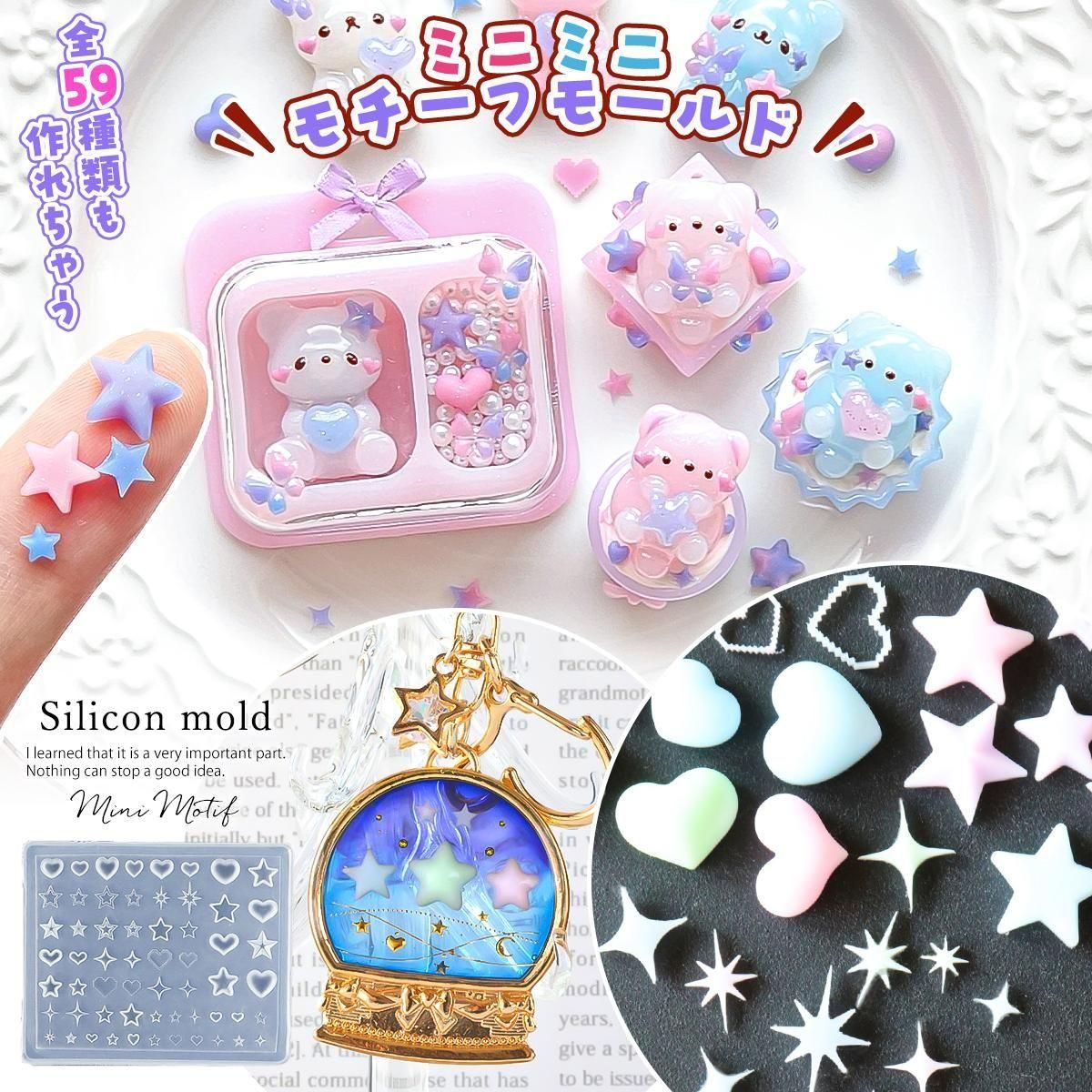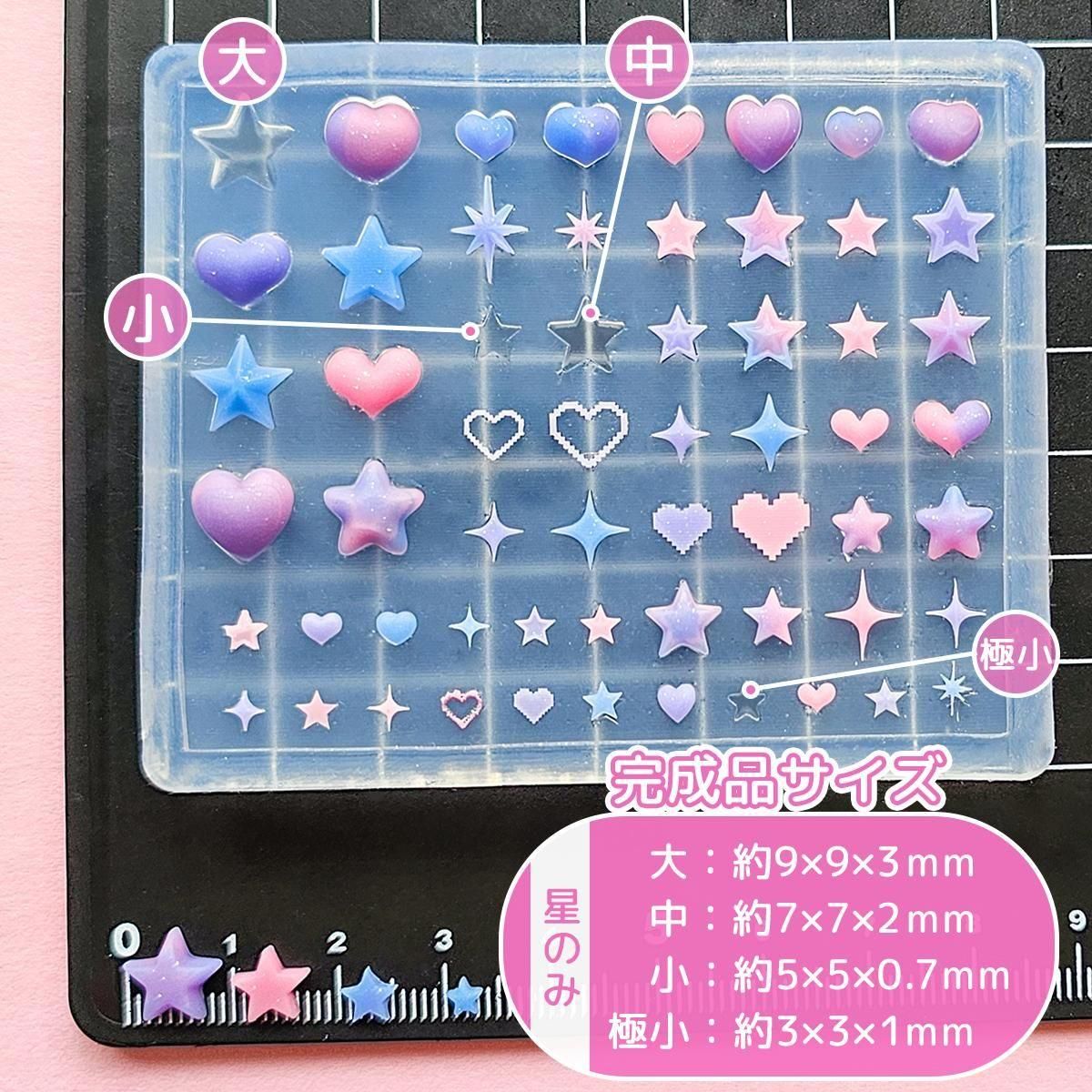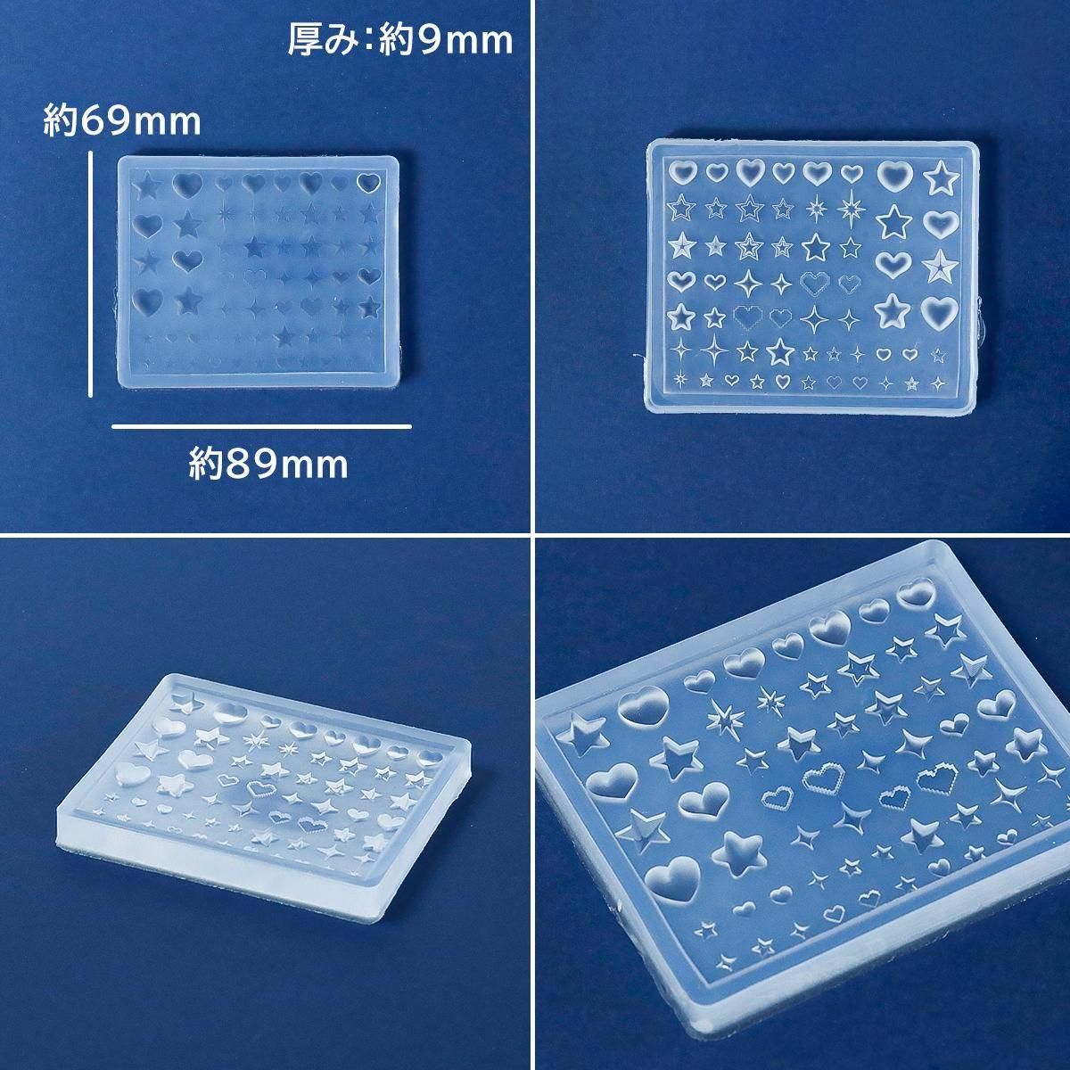大から極小まで揃ってる♪形も厚みもいろいろなミニミニモチーフが作れるシリコンモールド。指先サイズのハートとスターのモチーフが、59個も揃ってるよ!