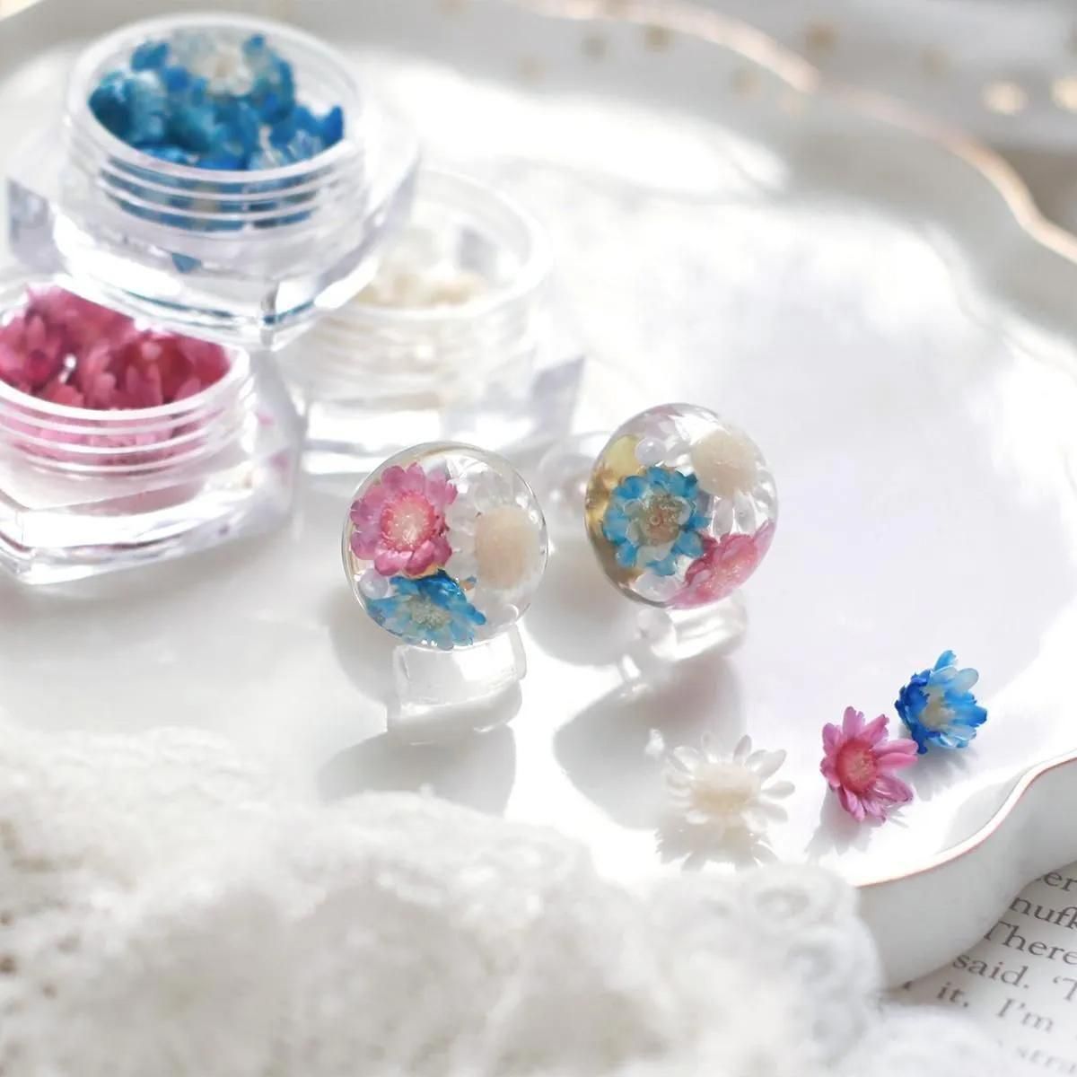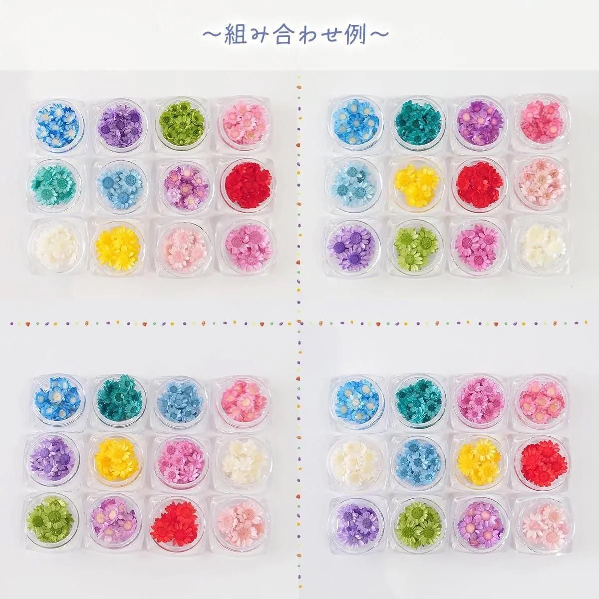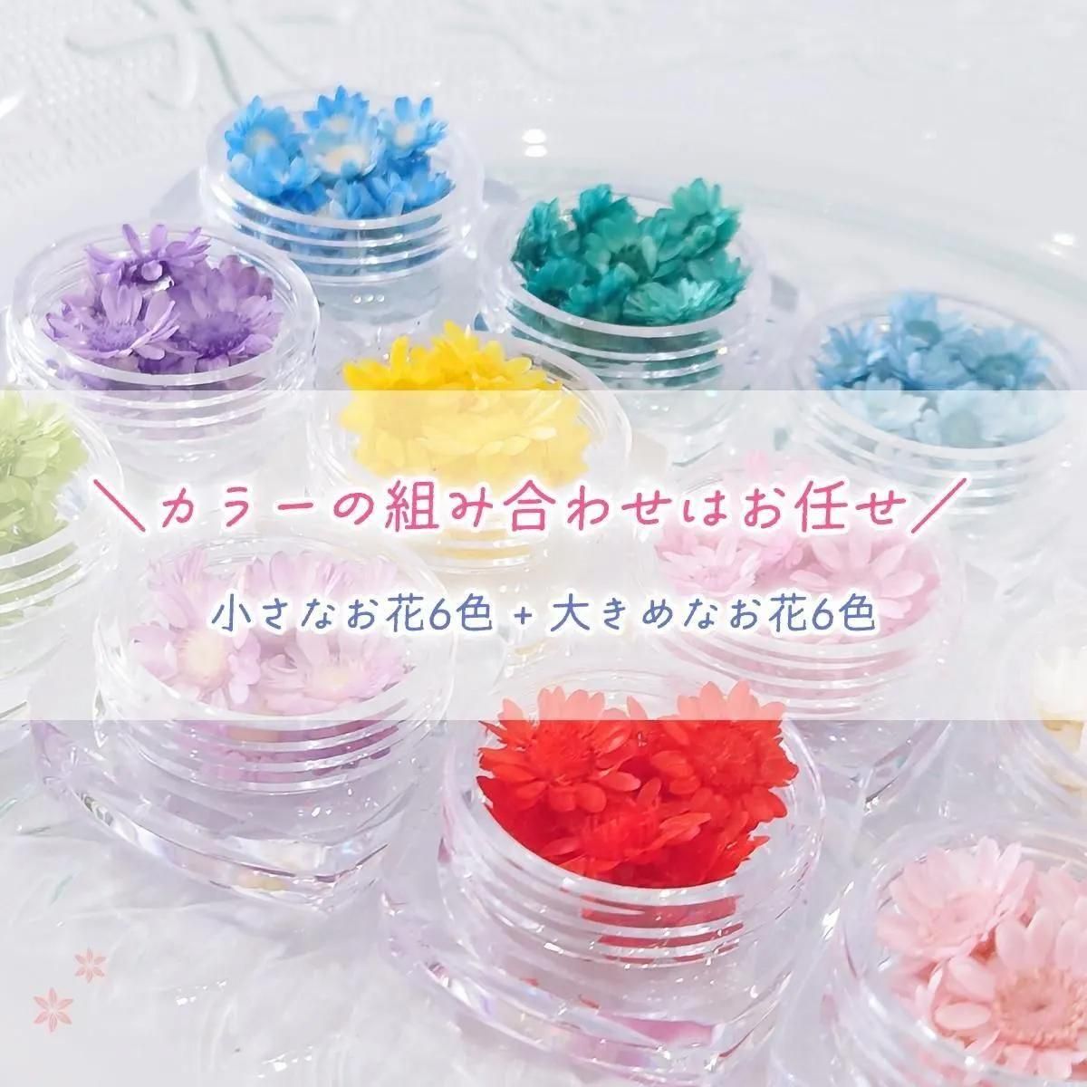 GreenOcean熟練スタッフが厳選した12種類のスターフラワーが入ったお得なセットだよ!透明感のあるレジン作品に封入すると素敵な作品に。お花は色ごとにケースに入っているから使いやすいよ!